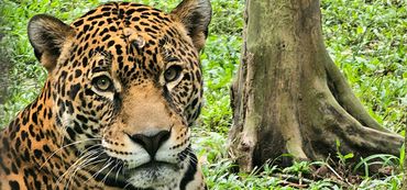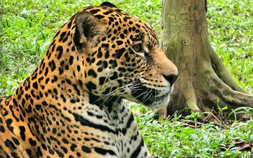 A colorful jaguar against a gray background with eye contrast enhanced
