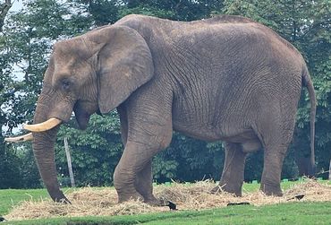 Side view of an elephant's head and front legs